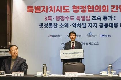 뉴한국방송뉴스통신사 신유철기자 기자 | 전북특별자치도를 비롯한 4개 특별자치시·도가 8일 긴급 회동을 갖고 '3특·행정수도 특별법' 조속 통과를 촉구하며 한목소리를 냈다. 김관영 전북도지사, 김진태 강원도지사, 최민호 세종시장, 고용균 제주 부지사는 이날 콘래드서울호텔에서 대한민국특별자치시도 행정협의회 간담회를 열고 향후 공동 대응방안을 논의했다. 이번 긴급 회동은 최근 국회에서 '행정통합 특별법' 논의가 급물살을 타면서 먼저 출발한 특별자치시·도 법안 심사가 지연되고, 정책적으로 소외될 수 있다는 우려가 커지면서 성사됐다. 김관영 전북도지사는 "광역행정통합 논의가 급물살을 타면서 자칫 먼저 출발한 특별자치시·도들이 우선순위에서 밀려나는 것 아니냐는 우려가 크다"며 "대한민국 균형발전은 거대 경제권인 '5극'만으로는 완성될 수 없다"고 강조했다. 이어 "아무리 강력한 엔진(5극)이 힘을 내뿜어도, 그 에너지를 국토 구석구석 전달하며 마찰을 줄여주는 밸런서(특별자치시도)가 제 기능을 못 하면 대한민국이라는 배는 한쪽으로 기울어 멈춘다"며 "모든 지역은 선후, 경중의 문제가 아니라 서로의 성공을 견인하는 동등하고