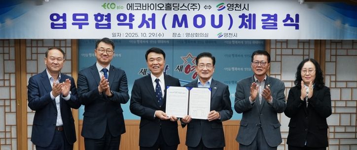 뉴한국방송뉴스통신사 신유철기자 기자 | 영천시는 29일 시청 영상회의실에서 최기문 시장, 송효순 에코바이오홀딩스㈜ 대표 등 관계자들이 참석한 가운데 ‘바이오가스 기반 청정수소 생산 통합사업’에 관한 업무협약(MOU)을 체결했다.