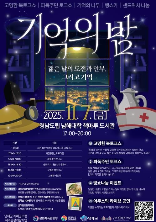 뉴한국방송뉴스통신사 신유철기자 기자 | ‘젊은 날의 도전과 안부, 그리고 기억’이라는 주제로 독일마을 기억의 밤 행사가 오는 11월 7일 17시부터 경남도립남해대학 책마루도서관에서 열린다.