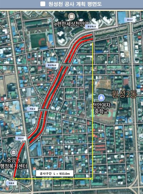 시는 원성동 일원에서 추진 중인 원성동(2단계) 하수관로 및 차집관로 정비 공사의 일환으로 원성천 산책로 약 1km 구간(대흥로~원성제1교)에 걸쳐 하수관로를 새로 정비한다.