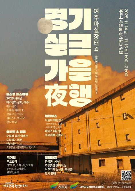 뉴한국방송뉴스통신사 신유철기자 기자 | 여주시는 오는 11월 14일부터 15일까지 이틀간 여주 경기실크 일원(여주시 하동 123-6번지)에서 '여주마실장터4 가을야행'을 개최한다고 밝혔다. 이번 행사는 '2025 새로운 버스킹의 성지, 여주!'라는 슬로건 아래, 깊어가는 가을밤의 정취를 더할 버스킹 페스티벌과 함께 다채로운 마켓과 체험을 선보일 예정이다.