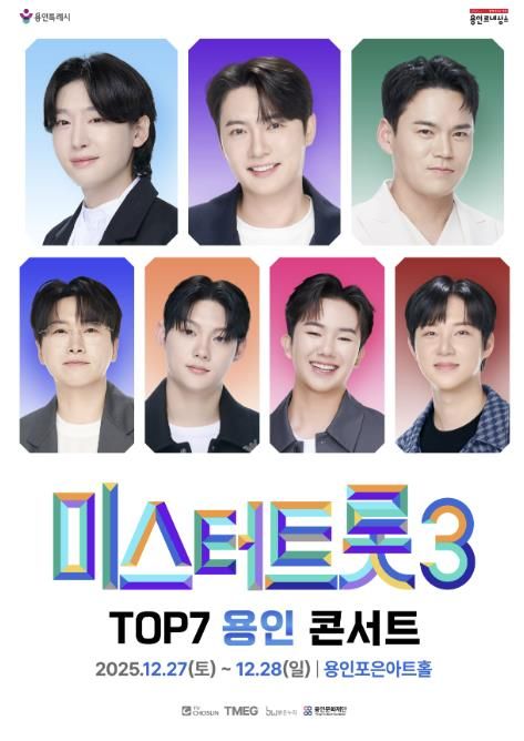 뉴한국방송뉴스통신사 신유철기자 기자 | 용인문화재단은 오는 12월 27일부터 28일까지 용인포은아트홀에서 ‘미스터트롯3 TOP7 콘서트’를 선보인다. 공연은 27일 오후 1시·6시, 28일 오후 1시 총 3회 진행된다.