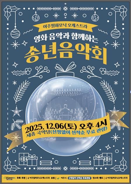 뉴한국방송뉴스통신사 신유철기자 기자 | 여주 필하모닉 오케스트라는 오는 12월 6일 오후 4시, 세종국악당에서 '영화 음악과 함께하는 2025 송년음악회'라는 주제로, 연말을 맞아 여주시민과 함께 영화 속 명장면을 음악으로 되살리는 특별한 무대를 준비한다.