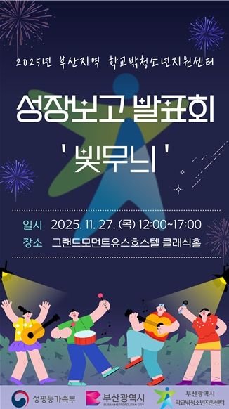 뉴한국방송뉴스통신사 신유철기자 기자 | 부산시는 27일 낮 12시 남구 그랜드모먼트 유스호스텔에서 '2025년 부산지역 꿈드림 성장보고 발표회 '빛무늬''가 열린다고 밝혔다.