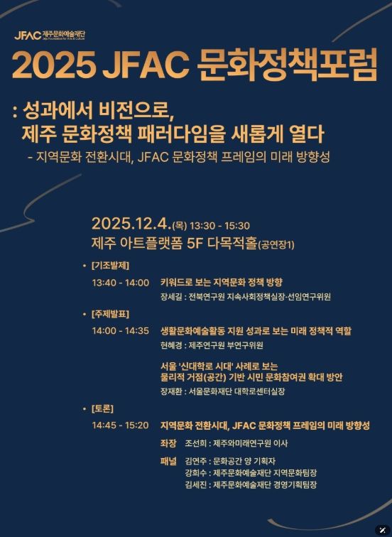 문화정책포럼은 〈성과에서 비전으로, 제주 문화정책 패러다임을 새롭게 열다〉를 주제로 개최한다. 포럼은 ▲기조발제 ‘키워드로 보는 지역문화 정책 방향(장세길 전북연구원 선임연구위원)’, ▲주제발표① ‘생활문화예술활동 지원 성과로 보는 미래 정책적 역할(현혜경 제주연구원 부연구위원)’, ▲주제발표② ‘서울 ’新대학로 시대‘ 사례로 보는 물리적 거점 기반 시민 문화참여권 확대 방안(장재환 서울문화재단 대학로센터 실장)’, ▲패널 토론으로 진행된다.