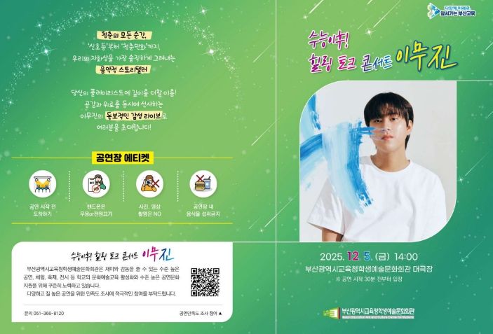 뉴한국방송뉴스통신사 신유철기자 기자 | 부산광역시교육청학생예술문화회관(관장 박은혜)은 오는 5일 오후 2시 학생예술문화회관 대극장에서 수능을 마친 고3 학생 700여 명을 대상으로 가수 이무진과 함께하는 ‘수능 이후! 힐링 토크 콘서트’를 개최한다.