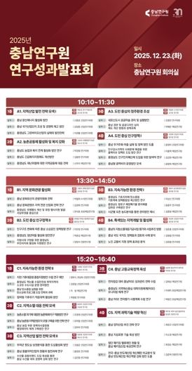 뉴한국방송뉴스통신사 신유철기자 기자 | 충남연구원은 오는 23일 오전 9시부터 연구원(공주 본원)에서 ‘2025년 연구성과발표회’를 개최하고, 올 한 해 동안 축적한 연구성과를 도 및 시·군 정책 수요자와 도민에게 공유하는 자리를 마련한다고 밝혔다.