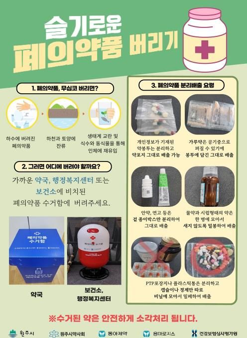 뉴한국방송뉴스통신사 양호선기자 기자 | 원주시는 가정에서 배출되는 유통기한 지난 폐의약품을 안전하게 처리하기 위하여 올바른 분리배출 방법 홍보에 나섰다.