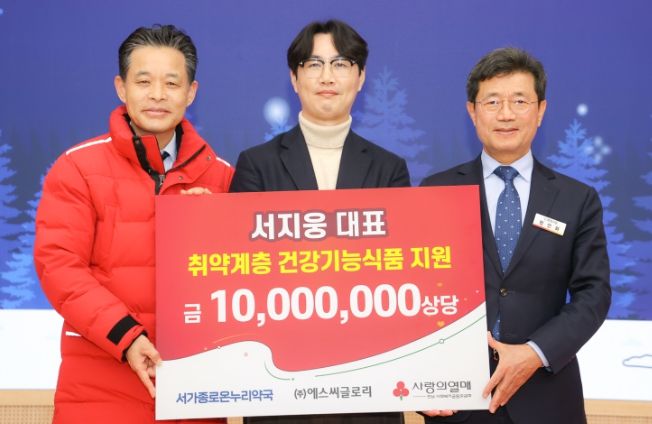 뉴한국방송뉴스통신사 신다은기자 기자 | 서지웅 서가종로온누리약국·㈜에스씨글로리 대표가 지난 15일 지역 취약계층을 위해 1천만 원 상당의 건강기능식품을 전남사회복지공동모금회에 전달했다.
