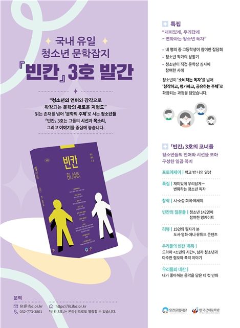 뉴한국방송뉴스통신사 신유철기자 기자 | 인천문화재단 한국근대문학관은 국내 유일의 청소년 문학잡지 [빈칸] 3호를 발간했다.