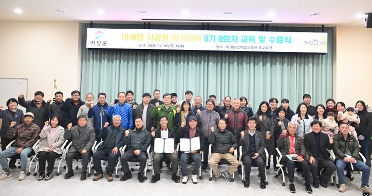 뉴한국방송뉴스통신사 신유철기자 기자 | 거창군은 지난 18일 농업기술센터 미래농업복합교육관 2층 중교육장에서 49명의 교육생이 참석한 가운데 ‘미래형 사과원 아카데미 9기’ 수료식을 개최했다.