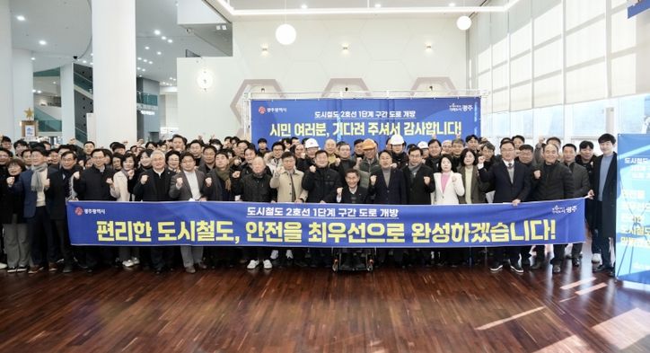 광주광역시는 이날 시청 시민홀에서 ‘광주도시철도 2호선 1단계 구간 도로개방 현장 확인’ 행사를 열고, 그동안의 공사 추진 경과와 현재 공정 현황, 향후 계획을 시민들과 공유했다.