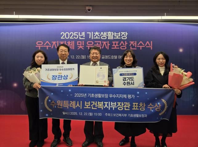 뉴한국방송뉴스통신사 신유철기자 기자 | 수원특례시가 보건복지부 주관 ‘2025년 기초생활보장·긴급지원 사업’ 평가에서 우수 지자체로 선정돼 보건복지부 장관 표창을 받았다. 시상식은 22일 서울 글래드호텔에서 열렸다.