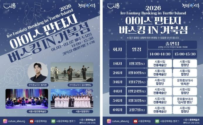 뉴한국방송뉴스통신사 신유철기자 기자 | 시흥시는 지난 연말에 진행된 ‘2025 시흥 사운드 오브 윈터’의 열기를 잇는 후속 문화예술 프로그램으로, 겨울철 거북섬을 찾는 시민과 관광객에게 풍성한 즐길 거리를 제공하고자 ‘2026 아이스 판타지 버스킹 인 거북섬’을 운영한다.