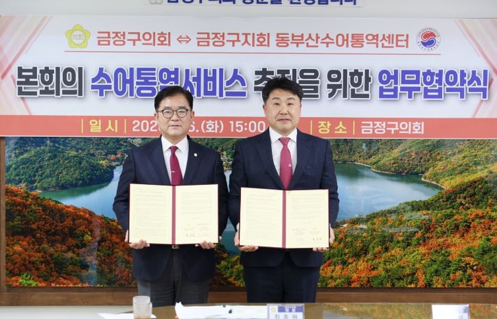 뉴한국방송뉴스통신사 신유철기자 기자 | 금정구의회는 2026년 1월 6일, 금정구의회 의장실에서 동부산수어통역센터(센터장 여복기)와 '본회의 수어통역 서비스 제공을 위한 업무협약'을 체결했다.
