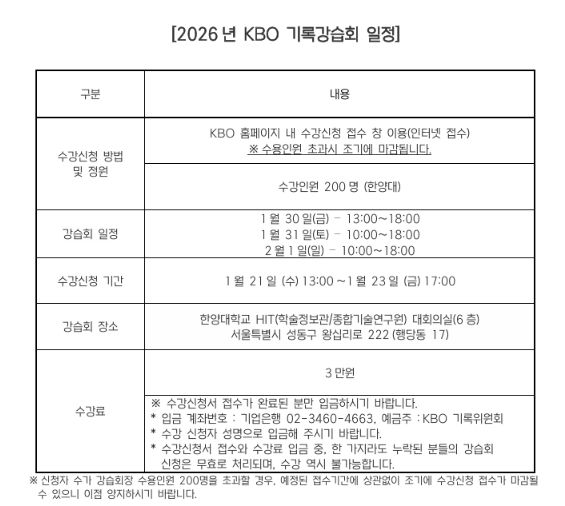 뉴한국방송뉴스통신사 신유철기자 기자 | 2026년 KBO 기록강습회가 1월 30일(금)부터 2월 1일(일)까지 서울 한양대학교에서 개최된다. 기록강습회는 야구 공식기록법의 보급과 이해를 통한 저변 확대를 목적으로 프로야구 원년인 1982년부터 개최됐다.