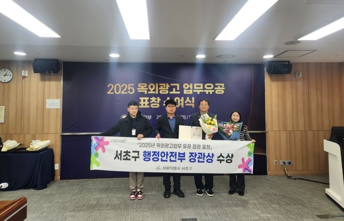 전성수 서초구청장은 “이번 수상은 불법광고물에 적극적으로 대응하고 예방 중심의 정책과 올바른 광고 문화 확립을 위해 지속적으로 노력해 온 결과”라며, “앞으로도 공공성과 친환경 가치를 함께 실현하는 옥외광고 행정을 지속적으로 펼쳐 나가겠다”고 밝혔다.