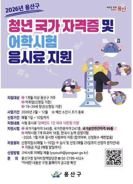 뉴한국방송뉴스통신사 신유철기자 기자 | 서울 용산구가 올해 ‘청년 국가자격증 및 어학시험 응시료 지원 사업’ 예산과 지원 종목을 대폭 확대해 시행한다. 기존 대비 지원대상을 100여 명 늘리고, 국가공인민간자격 99종을 새롭게 추가했다.