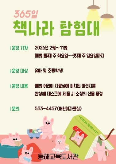 안은희 관장은 “‘365일 책나라 탐험대’를 통해 어린이들이 도서관 방문을 즐겁게 느끼고, 다양한 독서 경험을 쌓아 평생 독자로 성장하는 계기가 되기를 바란다”고 말했다.