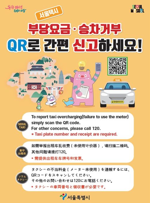 서울시는 외국인이 택시 이용 중 부당요금이나 불편을 겪었을 경우 현장에서 바로 신고할 수 있도록 택시 내부 및 주요 관광지 등에 ‘QR 택시 불편신고 시스템’ 안내 스티커·현수막·포스터를 부착하고, 서울시 공식 SNS를 통해서도 지속적으로 홍보하고 있다.