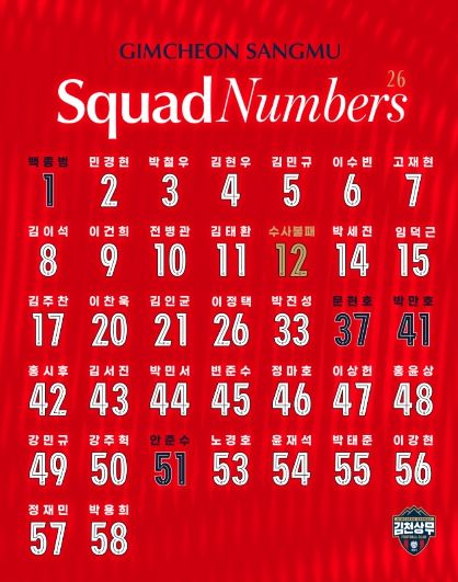 뉴한국방송뉴스통신사 신유철기자 기자 | 김천상무가 2026시즌 프로선수단 배번을 공개했다.