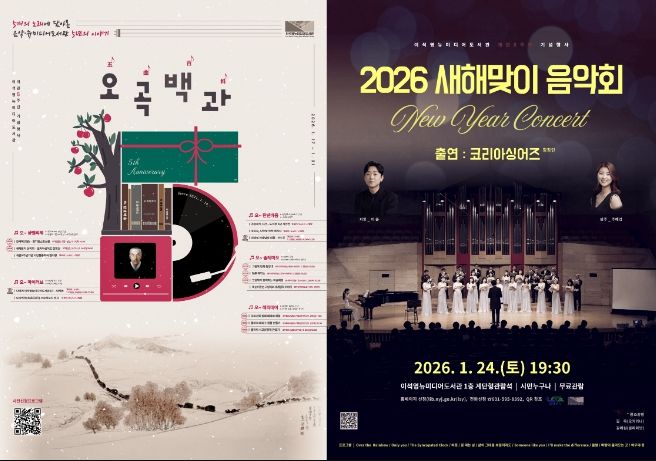 대표 프로그램으로는 오는 24일 오후 7시 30분, 도서관 1층 계단형 관람석에서 열리는 ‘2026 새해맞이 음악회’가 있다. 음악회에는 코리아싱어즈 합창단, 오카리나 연주자 김욱, 클라리네티스트 김예원 등이 출연해 새해의 희망을 전하는 공연을 선보인다.