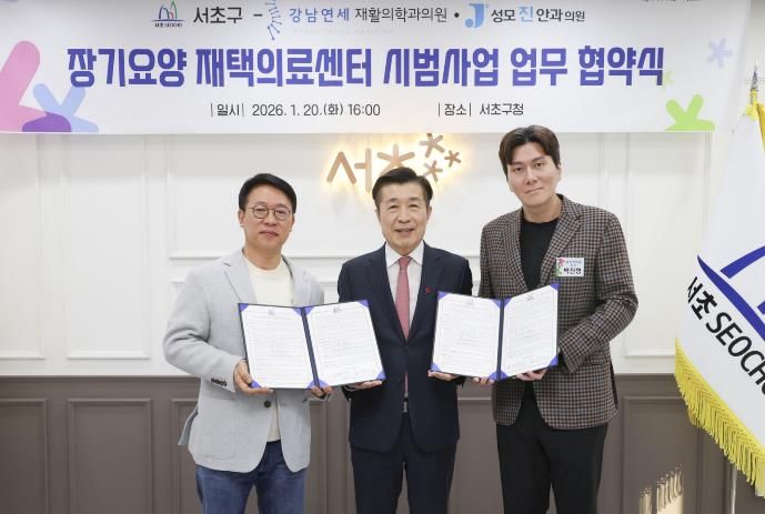 뉴한국방송뉴스통신사 신유철기자 기자 | 서울 서초구는 20일 성모진안과의원, 강남연세재활의학과의원과 함께 ‘장기요양 재택의료센터 시범사업’ 확대를 위한 업무협약(MOU)을 체결했다고 밝혔다. 이번 협약은 오는 3월 시행되는 돌봄통합지원법에 앞서 지역 내 요양·의료·돌봄 연계 체계를 선제적으로 강화하기 위한 조치다.