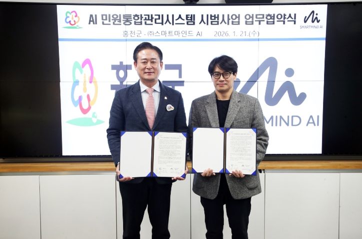 뉴한국방송뉴스통신사 양호선기자 기자 | 홍천군은 민원 처리의 신속성과 정확성을 높이기 위해 ㈜스마트마인드(대표 이상수)와 ‘AI 민원통합관리시스템’ 시범 사업 협약을 체결했다.