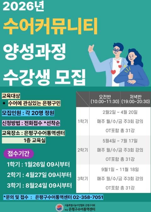 뉴한국방송뉴스통신사 신유철기자 기자 | 서울 은평구는 ‘2026년 수어커뮤니티 양성과정’ 1학기 수강생을 26일 오전 9시부터 선착순으로 20명을 모집한다고 밝혔다.