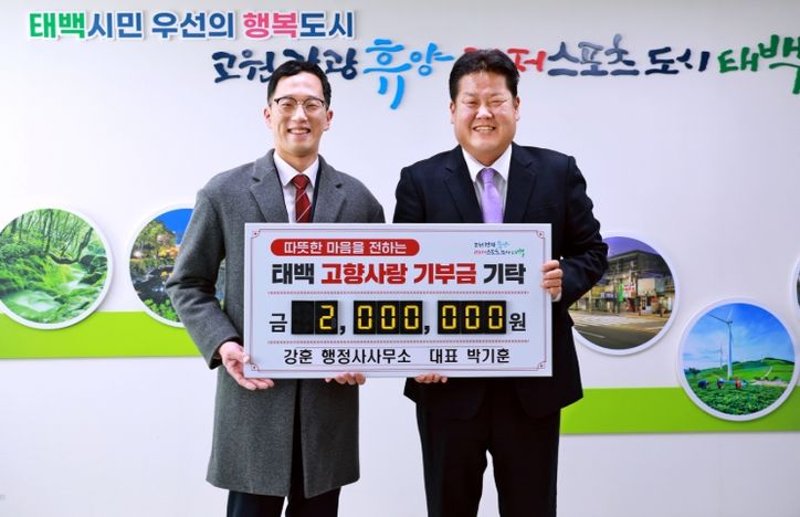 뉴한국방송뉴스통신사 양호선기자 기자 | 태백시는 지난 27일 강훈 행정사무소 박기훈 대표가 태백시청을 방문해 고향사랑기부금 200만 원을 기탁했다고 밝혔다.