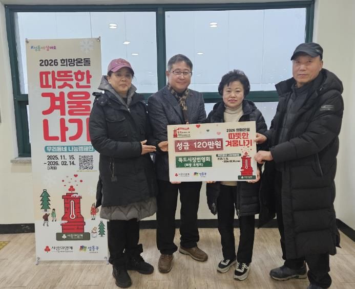 김범철 성수2가제1동장은 “경기 침체 속에서도 이웃을 위한 나눔을 실천해 주신 뚝도시장번영회에 깊이 감사드린다”라며 “성금은 희망온돌 따뜻한 겨울나기 사업을 통해 관내 저소득 취약계층을 위해 소중히 사용하겠다”라고 말했다.