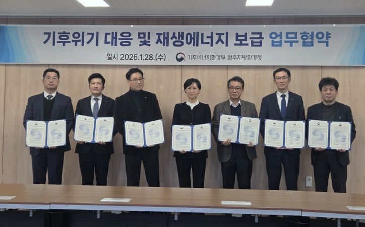 뉴한국방송뉴스통신사 권영분기자 기자 | 충북도는 28일 원주지방환경청, 강원특별자치도 및 에너지 공기관과 함께 기후위기 대응 역량을 강화하고 재생에너지의 안정적인 보급 확대를 위한 업무협약을 체결했다.