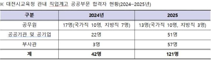 뉴한국방송뉴스통신사 신태공 기자 | 대전시교육청은 2025년 관내 직업계고 학생들의 공무원, 공공기관 및 공기업, 군부사관 합격 현황을 분석한 결과, 총 121명이 합격하며 전년 대비 비약적인 성장을 기록했다고 밝혔다.