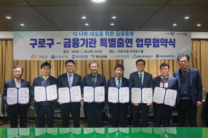 뉴한국방송뉴스통신사 신유철기자 기자 | 구로구가 1월 29일 구청 3층 르네상스홀에서 신한은행, 우리은행, 하나은행, 국민은행, 새마을금고, 서울신용보증재단과 ‘더 나은 내일을 위한 금융동행’ 특별출연 협약을 체결하고, 총 212억 5천만 원 규모의 중소기업·소상공인 특례보증을 추진한다.