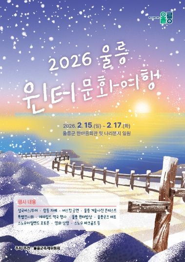 울릉군은 현재 선박 할인 혜택을 제공하는 ‘울릉 윈터패스’가 1~2월 두 달간 운영되고 있는 가운데, 겨울철 지역 문화 콘텐츠 확산과 관광 활성화를 위해 '2026년 울릉 윈터문화여행'을 오는 2월 15일부터 17일까지 3일간, 울릉한마음회관과 나리분지 일원에서 펼쳐진다.