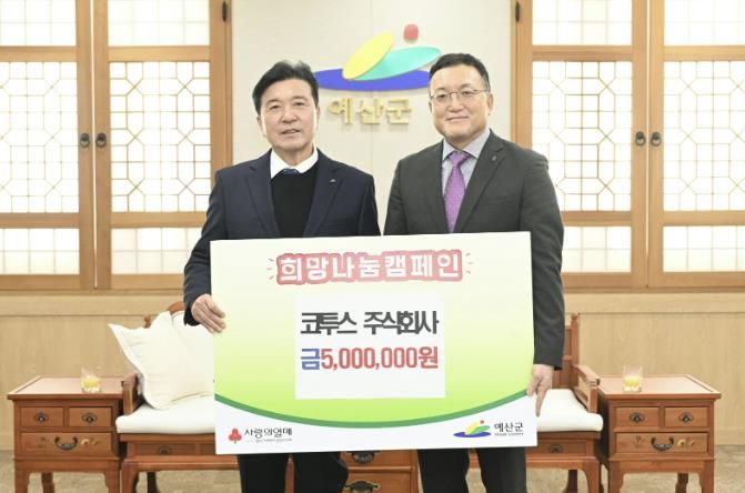 뉴한국방송뉴스통신사 신태공 기자 | 예산군은 예당호 모노레일 운영회사인 주식회사 코투스가 어려운 이웃을 돕기 위한 ‘희망 2026 나눔캠페인’에 동참해 성금 500만 원을 기탁했다고 2일 밝혔다.