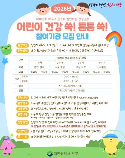뉴한국방송뉴스통신사 신태공 기자 | 대전 서구는 27일까지 2026년도 어린이 건강증진 프로그램 ‘어린이 건강 쑥! 튼튼 쑥!’ 참여 기관을 모집한다.