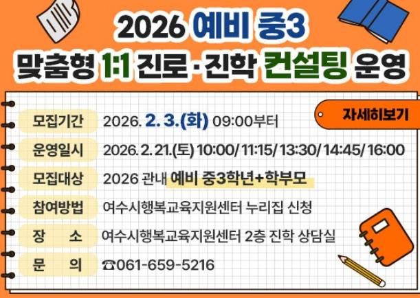 뉴한국방송뉴스통신사 신다은기자 기자 | 여수시가 관내 학생과 학부모를 위해 오는 2월 21일 여수시행복교육지원센터에서 ‘예비 중3 맞춤형 1:1 진로·진학 컨설팅’을 운영한다.