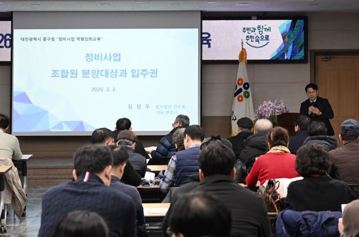 뉴한국방송뉴스통신사 신태공 기자 | 대전 중구는 2일 중구청 대회의실에서 재개발‧재건축 정비사업 관계 공무원 및 조합 임원 등 60여 명을 대상으로 ‘정비사업 역량강화 교육’을 실시했다고 밝혔다.