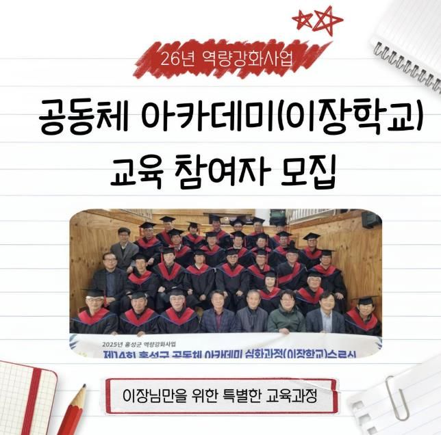 뉴한국방송뉴스통신사 신태공 기자 | 홍성군 마을만들기지원센터는 마을 운영과 의사결정의 핵심 주체인 마을리더의 역량 강화를 위해 공동체 아카데미 심화과정 ‘이장학교’ 참여자를 모집한다.