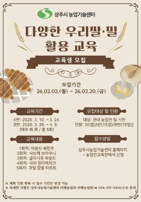 뉴한국방송뉴스통신사 신유철기자 기자 | 상주시농업기술센터는 2월 2일부터 2월 20일까지‘다양한 우리쌀·밀 활용 교육’교육생을 모집한다고 밝혔다.