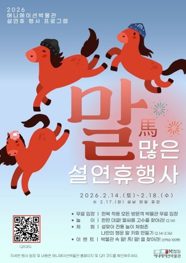뉴한국방송뉴스통신사 신유철기자 기자 | 춘천 애니메이션박물관(토이로봇관)은 2026년 병오년(말의 해)을 맞아 2월 14일부터 18일까지 설맞이 문화행사 '말(馬) 많은 설연휴'를 운영한다. 이번 행사는 놀이를 매개로 관람객이 함께 참여하며, 자연스럽게 소통할 수 있도록 구성된 참여형 문화행사다.