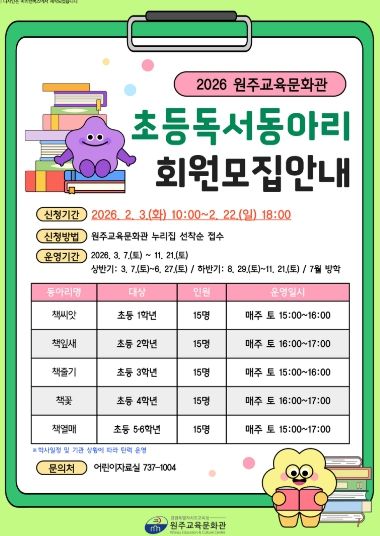 뉴한국방송뉴스통신사 양호선기자 기자 | 원주교육문화관(관장 용석태)은 2월 3일부터 선정 도서를 깊이 읽는 활동을 통해 문해력을 강화하고 지역사회 독서 공동체를 활성화하기 위해 초등학생과 중학생을 대상으로 ‘2026년 독서동아리 회원 모집’을 실시한다.