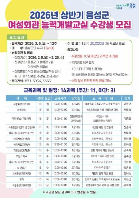 뉴한국방송뉴스통신사 권영분기자 기자 | 음성군은 2026년 상반기 여성회관 능력개발교실 수강생을 모집한다.