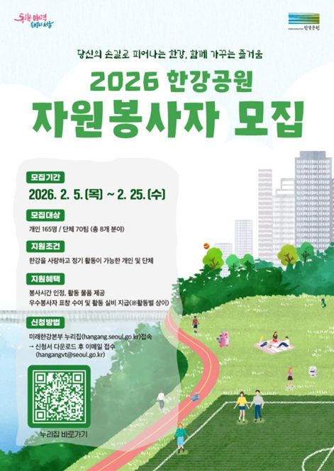 뉴한국방송뉴스통신사 신유철기자 기자 | 서울시 미래한강본부가 시민의 손길로 한강의 가치를 피워내고 함께 가꾸는 즐거움을 공유할 ‘2026년 한강공원 정기 자원봉사자’를 모집한다. 접수 기간은 2월 5일부터 2월 25일까지 약 3주 간이다.