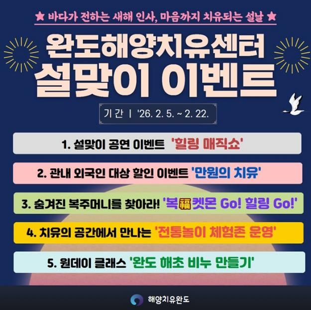 뉴한국방송뉴스통신사 신다은기자 기자 | 완도군은 설 명절을 맞아 귀성객, 군민, 관광객이 그동안 쌓인 피로를 풀고 활력을 얻을 수 있도록 ‘완도해양치유센터, 설맞이 힐링 이벤트’를 2월 5일부터 22일까지 운영한다.