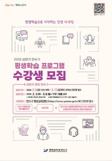 뉴한국방송뉴스통신사 신유철기자 기자 | 연수구가 4차 산업혁명과 디지털 전환 시대를 선도할 구민 역량 강화를 위해 ‘2026년 상반기 평생학습 프로그램’ 수강생을 모집한다.