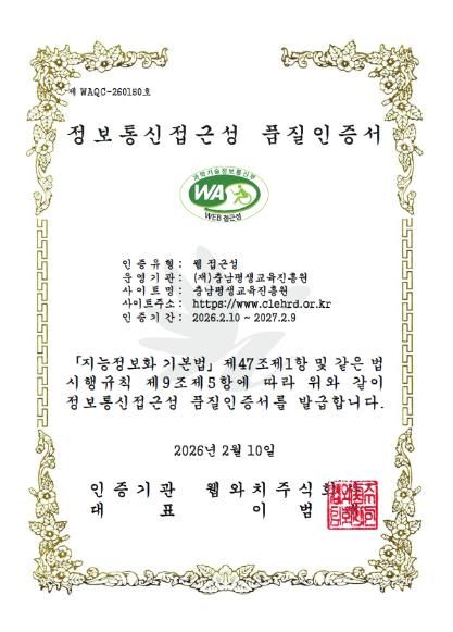 뉴한국방송뉴스통신사 신유철기자 기자 | 충남평생교육진흥원은 과학기술정보통신부 지정 국가공인 인증기관(㈜웹와치)으로부터 정보통신접근성 품질인증을 획득했다고 밝혔다.