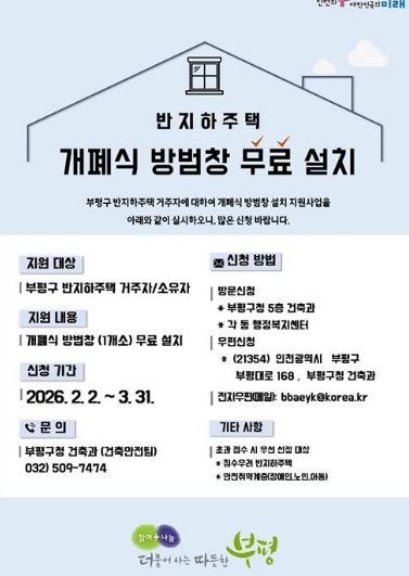 뉴한국방송뉴스통신사 신유철기자 기자 | 부평구가 오는 3월 31일까지 지역 내 반지하주택을 대상으로 ‘2026년 개폐식 방범창 설치 지원사업’ 신청을 받는다고 밝혔다.