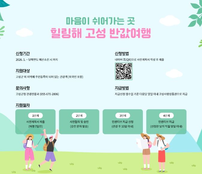 뉴한국방송뉴스통신사 신유철기자 기자 | 고성군은 관광객 유치증대 및 체류형 관광 활성화로 지역경제에 활력을 불어넣기 위해 2026년 신규사업으로 ‘마음이 쉬어가는 곳, 힐링해 고성 반값여행’을 시행한다고 밝혔다.